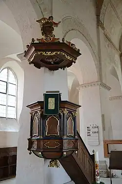 Die hölzerne Kanzel im Stil des Barocks besitzt einen polygonen Kanzelkorb mit glatten Ecksäulen und leeren, von Profilleisten umrahmten Feldern.