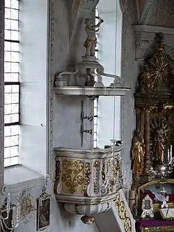 Der hölzerne Kanzelkorb im Stil des Barocks, der mit Ornamenten geschmückt ist, wurde um 1726 geschaffen. Der erst 1764 geschaffene Schalldeckel wird von einem Putto bekrönt, an der Unterseite ist die Heiliggeisttaube zu sehen.