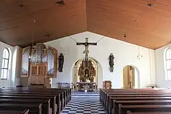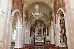 Der Innenraum ist eine dreischiffige, dreijochige Halle mit gestaffelten Seitenschiffen in romanischen Proportionen mit frühhistoristischem Dekor. Alle drei Schiffe haben Kreuzgewölbe. Die östlichen Seitenjoche sind nach Norden und Süden etwas verbreitert. In den Schildbogenfeldern des Mittelschiffes werden Szenen der Ostergeschichte dargestellt: der Ölberg, die Kreuztragung, die Kreuzigung und die Auferstehung. Die Glasmalerei aus der zweiten Hälfte des 16. Jahrhunderts im Ostfenster des nördlichen Seitenschiffes stellt Maria Magdalena unter dem Kruzifix dar. Der heutige Chor des 19. Jahrhunderts ist kurz und endet gerade. Hier steht der Hochaltar.