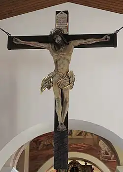 Das spätgotische Kruzifix stammt von 1510/20, die Kreuzwegbilder aus dem späten 19. Jahrhundert. Das Votivbild der heiligen Ursula malte 1862 ein A. Melchior. Am südlichen Pfeiler hängt ein Bild der Krönung des heiligen Kanzian aus dem 17. Jahrhundert.