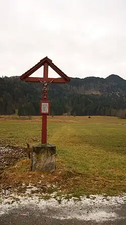 Etwa 500 m südwestlich von der Kapelle Bildbühl steht in der Flurparzelle „Rotes Krüz“ das Blutkreuz (678 m. ü. M.). Der Sage nach, soll immer abends ein schwarzer Pudel an der Alpgasse kauernd angetroffen worden sein. Er soll ganz ungehalten die vorbeigehenden Leute angesprungen haben, sodass sie Reißaus nahmen. Ein besonders mutiger Bub packte den Hund einmal fest mit beiden Händen und fragte: "Was begehrst du?" Da soll der schwarze Pudel winselnd geantwortet haben, er sei eine unredliche Seele und harre hier seiner Erlösung. Er habe in seinem Leben in der Nähe einmal eine Bluttat begangen. Wenn man an dieser Stelle ein rotes Kreuz errichte, sei er erlöst. Seit dieser Zeit steht das "rote Kreuz" an der Alpgasse draußen, und vom schwarzen Pudel wurde nie mehr etwas gesehen oder gehört.[3]