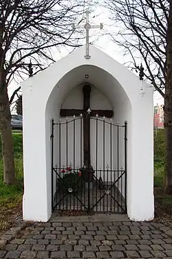 - In der Kapelle ein Kruzifix, Blumen und eine Laterne.