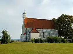 Die um 1620 erbaute Kapelle wurde nach einem Brand 1729 erneuert. Außen ist der Putz der Wände als Läuferverband in Sgraffito bemalt. Die Saalkirche besteht aus einem Langhaus, einem rechteckigen Chor im Osten und einer Sakristei an der Nordwand des Chors, über der sich ein Oratorium befindet. Über der Fassade im Osten erhebt sich ein achteckiger Giebelreiter, der mit einer Zwiebelhaube bekrönt ist. Der Innenraum des Langhauses ist mit einem Stichkappengewölbe überspannt. Der Altar und ein Kruzifix stammen vom Ende des 15. Jahrhunderts.