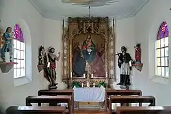 Im neugotischen Altar ist ein Gemälde der Muttergottes mit Kind zwischen Heiligen aus der zweiten Hälfte des 19. Jahrhunderts zu sehen.
