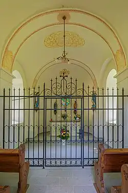 Der Altartisch ist ein Werk des Linzer Bildhauers Franz Stark. Darüber befindet sich eine Kreuzigungsgruppe des Bildhauers Engelbert Westreicher. Ferner befinden sich eine Immaculata- und eine Schutzengel-Statue in der Kapelle. Die originale Ausmalung stammte von den Dekorationsmalern Höpfl und Schweighart aus Breitenberg.[1]