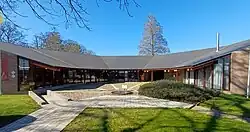 Das später aus Beton, Metall, Stein und Holz aus Spendenmitteln errichtete Haus der Begegnung, auch Haus der Versöhnung genannt, ist ein polygonales fünfteiliges Gebäude, das im Halbkreis angeordnet und mit seiner offenen Seite ebenfalls zum Weiher ausgerichtet ist. Ein Pultdach mit Gefälle zum Hofinneren sowie die Knickachsen des Gebäudes verstärken den Blickpunkt auf den Brunnen in der Mitte des Vorplatzes. Alle fünf Gebäudeteile, die unterschiedlichen Funktionen dienen, sind miteinander durch einen Wandelgang verbunden. Für reichlich Tageslicht sorgen die großen Fensterbänder an den höheren Außenseiten des Gebäudes.