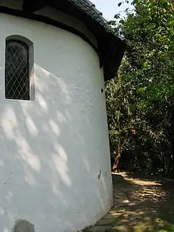 Der Saalbau wird durch eine halbrunde Apsis abgeschlossen. Vier mächtige Pfeiler stützen den Bau in den Ecken. Über dem Westteil ist ein kleiner Glockenstuhl mit einer Glocke aus dem Jahr 1821 angebracht. Der Dachstuhl ist mit grauen Pfannen gedeckt und auf Hängeknaggen gestützt. Im Nordwesten über der Eingangstür ragt das Dach weit hinaus.