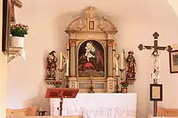 Der Altar im Stil der Neorenaissance zeigt das Altarbild Mariahilf und trägt die Figuren der Heiligen Philippus und Jakobus. Die barocke Ausstattung umfasst eine Madonna im Rosenkranz und einen Schutzengel.