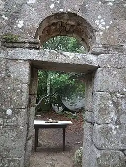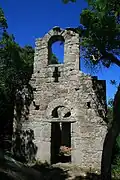 Die Westfassade erhöht eine intakte Espadaña (Glockengiebel) leicht versetzt zum romanischen Portal mit Türsturz. Nur noch teilweise erhalten ist das östliche Giebelfeld mit einem durchbrochenen griechischen Kreuz.