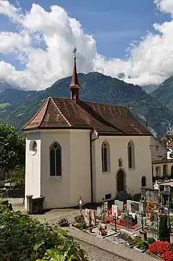 Aufgrund der Lage an einem Berghang ist das untere Geschoss nur vom weiter unten liegenden Kirchplatz erkennbar. Der niedrige Saal wird von einer beinahe rundbogigen Tonne überwölbt. Ein geschmiedetes Eisengitter trennt den vordersten Teil des Raumes ab; geschmückt ist es mit dem Allianzwappen der beiden Stifter: Landammann Emanuel Stanislaus Püntener (1682–1742)[2] und dessen Gattin Maria Anna Katharina Lusser (1689–1764).