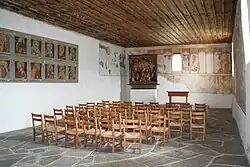 Der chorlose Rechtecksaal ist mit einer spätgotischen Holzdecke gedeckt. Der Altarraum ist baulich nicht ausgewiesen.