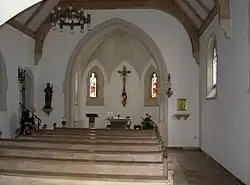 Das Kircheninnere, besonders die Empore, erinnert an die Zeit der Romanik. Der sichtbare Dachstuhl ist tonnenartig gewölbt. Im Altarraum fallen zwei neugotische Fenster auf.
