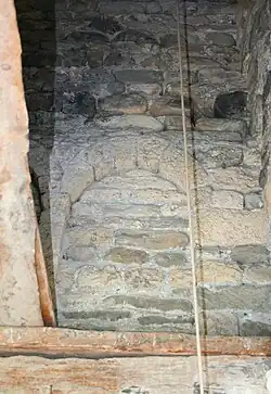 In der Mitte zwischen den ersten beiden seitlichen Streben wurde das Fundament eines Pfeilers festgestellt. Dies deutet darauf hin, dass der westliche Teil des Schiffes einmal zweigeteilt gewesen sein könnte, so eine Art Narthex bildete mit längsverlaufenden Gewölben, während das Gewölbe des vorderen Teils bis zum Chor quer verlief. Schiff und Chor sind mit Schindeln aus Lärchenholz gedeckt.