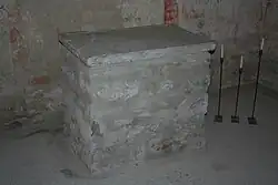 Auffallend ist der würfelförmige Altar mit einer Deckplatte aus weissem Marmor; 108 lang, 75 cm breit und 7 cm hoch. Sie zeigt ringsum drei eingetiefte Rillen und einen erhabenen Rand. Erwin Poeschel datiert sie ins 8. Jahrhundert. Auf der Unterseite zeigen vier quadratische Vertiefungen, dass die Platte einst als Tischaltar von Stützen getragen worden sein muss.