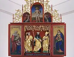Der spätgotische Flügelaltar wurde 1523 aufgestellt. In seinem Schrein, dem festen, verschließbaren Mittelteil, befinden sich Skulpturen des heiligen Leonhard, des heiligen Kaisers Heinrich und des heiligen Nikolaus. Auf dem in aufgeklapptem Zustand sichtbaren Innenteil der Altarflügel ist links Anna selbdritt und rechts die heilige Katharina aufgemalt. Die Rückseiten zeigen den heiligen Erasmus und den heiligen Christophorus. Im Gesprenge des Altars ist zwischen Rankenwerk und dünnen Fialen der heilige Sebastian dargestellt, begleitet von Halbbildern offenbar alttestamentlicher Gestalten. Die Predella des Altars zeigt Jesus am Kreuz mit Maria, seiner Mutter, und dem Apostel Johannes vor einer weiten Landschaft.