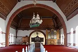 Im Innenausbau dominieren weißer Putz mit roten Ziegelbändern und Holztöne. Prägend sind die holzverschalte Decke mit ihrer hochwertigen, aber zurückhaltenden Verzierung und der große Rundbogen, der das Hauptschiff vom Querschiff abgrenzt. Das Motiv des Rundbogens wiederholt sich im kleineren Apsisbogen unmittelbar vor der Altarnische.