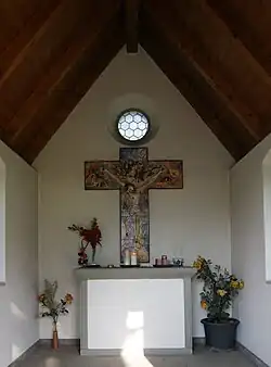 Der Betraum und Altarraum sind voneinander nicht abgegrenzt und ist zum Dachstuhl hin offen. Der mittelbraun lackierte Dachstuhl wird als gestalterisches Element eingesetzt. Die Fensterscheiben sind durch eine sechseckige Grundstruktur aufgelockert.