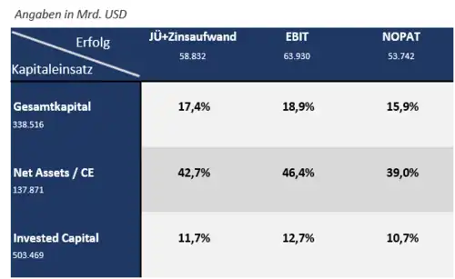 Für Apple berechnet sich auf Basis der Net Assets 2019 eine Kapitalrendite von 46,4 % vor Steuern bzw. 39,0 % nach Steuern. Die Rendite auf den Marktwert des gesamten Vermögens (inklusive Markenwerten, Kundenwerten etc.) belief sich dagegen nur auf 12,7 % vor Steuern bzw. 10,7 % nach Steuern. Die Abgrenzung des Kapitaleinsatzes bestimmt mithin maßgeblich die errechnete Rendite.