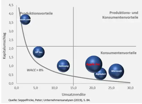 Die nebenstehende Abbildung stellt Kapitalumschlag, Umsatzmarge sowie die resultierende Kapitalrendite für verschiedenen Technologieunternehmen im Jahre 2019 dar. Zur Orientierung ist ein WACC von 8 % (entspricht in etwa den durchschnittlichen Kapitalkosten der Unternehmen) abgetragen. Überdurchschnittlich hohe Umsatzrenditen deuten auf besondere Erfolge am Absatzmarkt. Unternehmen wie Apple oder Microsoft verfügen bei ihren Produkten über eine große Preissetzungsmacht und können gegenüber ihren Kunden hohe Margen durchsetzen. Die Margen sind bei Amazon.com im Handel deutlich geringer. Aufgrund des effizienten Kapitaleinsatzes bzw. des hohen Kapitalumschlags kann aber auch der Marktführer im Internethandel eine sehr hohe Kapitalrendite erwirtschaften.