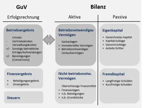 Aus analytischer Sicht ist es allerdings problematisch, dass die Aufspaltung des Vermögens in der Bilanz nicht mit der Aufspaltung des Erfolgs in der GuV korrespondiert. Die Gliederung der Bilanz ist eher den Bedürfnissen der Gläubiger ausgerichtet (Gläubigerschutz). Die Einteilung in kurz- und langfristiges Vermögen bzw. Schulden ermöglicht eine sinnvolle Analyse der Zahlungsfähigkeit/Liquidität eines Unternehmens. Die Gliederung nach Fristigkeit korrespondiert aber nicht mit der Darstellung in der GuV. In der Erfolgsrechnung wird der Erfolg nach den Quellen des Erfolgs (Leistungsbereich, Finanzbereich) aufgespalten. Für sinnvolle Gegenüberstellung von Erfolg und Kapitaleinsatz muss die Bilanz entsprechend umgestellt werden. Dies verdeutlicht nebenstehende Abbildung.