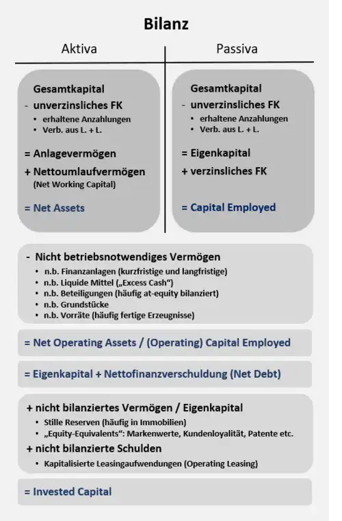 Auf der Passivseite der Bilanz werden häufig moderne Finanzierungsformen (wie operatives Leasing) nicht adäquat abgebildet. Der Barwert von Off-Balance-Finanzierungen ist allerdings nur dann zu berücksichtigen, falls auch die betrachteten Erfolge um die Zinserträge in den Leasingaufwendungen nach oben korrigiert wurden (dies ist eher selten der Fall). Den um nicht-bilanziertes Vermögen und Schulden bereinigten Kapitaleinsatz bezeichnet man auch als betriebsnotwendiges Vermögen (englisch invested capital) bzw. die Kapitalrendite auch als Return on Invested Capital (ROIC). Aufgrund der vielfältigen Möglichkeiten zur Bereinigung findet man in der Praxis entsprechend viele Berechnungsschemata für den ROIC. Derartige Bereinigungen haben sich mittlerweile auch bei der Berechnung von ROCE oder RONA etabliert. Insofern werden die Bezeichnungen für die operativen Kapitalrenditen (ROCE, RONA, ROIC) häufig auch synonym verwendet.