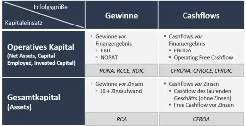 Ein besonderes Augenmerk gilt häufig der Analyse der operativen Ertragskraft eines Unternehmens. Dabei werden im Nenner des ROI Erfolgsgrößen vor Zinszahlungen (genauer vor Finanzergebnissen) analysiert. Operative Gewinne (wie z. B. EBIT oder NOPAT) oder operative Cashflows (wie z. B. EBITDA) werden nicht durch Erfolge im Finanzgeschäft (spiegeln sich in Finanzanlagen und Beteiligungen wider), von den Rahmenbedingungen am Kapitalmarkt (spiegeln sich im Zinsergebnis wider) oder der speziellen steuerlichen Situation des Unternehmens verzerrt. In der Folge eignen sich operative Kapitalrenditen sehr gut für Zeitvergleiche auf internationaler Ebene. Operative Kapitalrenditen eignen sich auch besser zur Beurteilung der Leistung des Managements, da viele Ergebnisbestandteile ausgeblendet werden, auf die das Management kaum Einfluss hat (Zinsergebnis, Beteiligungsergebnis, Steuern).