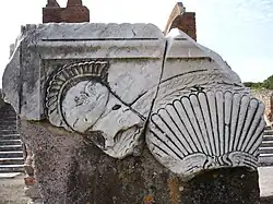 Vor dem Tempel stand ein mit Marmor verkleideter Altar, dessen Reliefdekoration Waffen zeigt.
