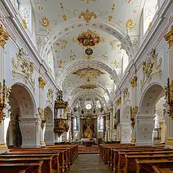 Das Langhaus hat drei Schiffe mit je vier Jochen, die mit böhmischen Kappen überspannt sind. Der Chor schließt übergangslos an das Langhaus an. Er hat zwei Joche, einen 5/8-Schluss und ist mit einer Kuppel versehen. Die geschwungene Orgelempore wird von Konsolen getragen. Die Seitenschiffe enden in einjochigen Kapellen die mit barocken schmiedeeisernen Gittern abgesperrt sind. Die Verzierungen der Joche, Säulen und Kappen bestehen überwiegend aus Stuck. Der Hochaltar ist in einem Achtel des Schlusses eingebaut.[4]