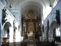Die Errichtung des Kapuzinerklosters fand in den Jahren 1618 bis 1620 statt. In den 1740er Jahren wurde die baufällige Kirche aus dem Jahr 1460 neu aufgebaut. Diese einschiffige Kirche war von einem Tonnengewölbe überdeckt und besaß vier Fenster je Längsseite.[2] Der Hochaltar, die beiden Seitenaltäre und einige andere Reliquien aus der Klosterkirche befinden sich in der heutigen Kirche des Elisabeth-Krankenhauses. Am 5. August 1746[3] wurde die Klosterkirche und das Kloster von Fürstäbtissin Franziska Christine von Pfalz-Sulzbach mit einem großen Fest für Stift und Stadt eingeweiht. Der Ordensguardian der Kapuziner kam dafür aus Münster angereist und dankte in seiner Festpredigt der Fürstäbtissin und den Bürgern der Kaiserlichen Freien Reichsstadt Essen. In dieser Formulierung sah die Äbtissin den unseligen Streit mit der Stadt erneut angefacht, was sie veranlasste, nicht nur alle Beihilfen für die Kapuziner zu streichen, sondern auch die fürstliche Bewirtung und Einquartierung der Ordensoberen während der jährlich stattfindenden Vorsprache im Schloss Borbeck. Daraufhin nahmen die Kapuziner sonntags drauf das Wort von der Kaiserlichen Freien Reichsstadt Essen in der Kapuzinerkirche zurück, womit sie nun in Gnaden zugelassen waren, was wiederum einen Konflikt mit dem Stadtrat zur Folge hatte.[4]