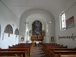 Der Kirchenraum besitzt ein schmuckloses Tonnengewölbe. Sein Ausstattungskonzept, das von Franz Pöhacker[4] entworfen worden ist, ist im Sinne franziskanischer Einfachheit auf Holzinventar ausgerichtet.
