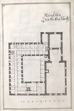 Der vierflügelige Konventstrakt der Kirchen wurde durch den Eingangskorridor (7) erschlossen. Der verschmälerte Ostflügel (9) beinhaltete die Besucherloge (10) des Presbyteriums. Klosterhofseitig (8) war eine halboffene Galerie (9) angelegt. Über eine Tür zur Klausur gelangte man in die geschlossene Galerie (11) des Südflügels, die das Treppenhaus (12), das Refektorium der Mönche (13) und die Klosterküche (14) erschloss. Im abgetrennten Westflügel lag eine wiederum geschlossene Galerie (15), die zum Necessarium mit einem Waschraum (17) und den dahinter gelegenen Latrinen (18) führte. Die davor gelegene, über die Küche erreichbare Speisekammer war über ein zweites Treppenhaus (16), mit der Fruchtschütte und dem Keller verbunden. Im nördlichen Flügel, der wiederum durch eine halboffene Galerie (19) erschlossen wurde, lagen westlich das Audienzzimmer (20), der Hostienbackofen (21), die Registratur mit Archiv (22) und die Pförtnerloge (23). Im Obergeschoss des Trakts befanden sich Gästezimmer für die Visitatoren, das Refektorium und die Stube der Laienbrüder, Zellen für mehr als 30 Mönche sowie die Bibliothek.