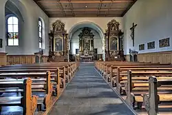 Den Grossteil des etwa 88 Meter[48] langen Nordflügels nimmt die Klosterkirche ein, eine geostete Saalkirche.[50] Bei der Vergrösserung der 1593 vollendeten ursprünglichen Kirche im Jahr 1629 wurden ihre beiden Chöre zum neuen Mönchschor am östlichen Ende des Flügels verschmolzen, ein Quadrat des Schiffs zum Laienchor umgewandelt und ein neues Schiff errichtet. Der dreiseitig geschlossene Mönchschor verfügt über Parkettboden sowie Kreuzrippen- und -gratgewölbe, während die Decke des Vorchors (ehemaliges Schiff) tonnengewölbt ist. Die Kassettendecke[51] und die Granitplatten als Bodenbelag im Langhaus gehen auf eine Renovierung im Jahr 1947 zurück, wie auch die Empore. Diese bisher letzte tiefgreifende, von den Denkmalpflegern Gottlieb Loertscher und Linus Birchler begleitete Renovierung der Kirche sollte dem «Ideal grösstmöglicher kapuzinischer Schlichtheit»[52] folgen. Sie war mit der Entfernung von Ausstattungsteilen aus der zweiten Hälfte des 19. Jahrhunderts und reicher Dekorationsmalereien von Josef Heimgartner (1902) verbunden.[52] Auch wurde damals der Eingang zur Gruft verschlossen, die seit 1926 nicht mehr für Bestattungen genutzt worden war.[52] Seit 1932 befand sich ein Klosterfriedhof nordwestlich der Kirche.[50]