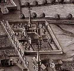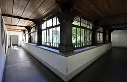 Kern der Anlage ist ein geschlossener Vierflügelbau, dessen Trakte sich um einen rechteckigen, etwa 22,5 × 17,5 Meter[48] messenden Innenhof gruppieren. Dieser ist – wie bei Klöstern üblich – von einem Kreuzgang umgeben, dessen Eichenpfosten eine flache Holzdecke tragen.[49] In der Mitte des Hofes steht eine Marienstatue aus Stein.