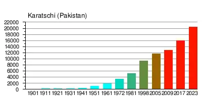 Mit 14,9 Millionen städtischen Einwohnern (2017)[1][2] ist Karatschi eine der größten Städte der Welt. In der Agglomeration leben 19,1 Millionen Menschen (2023).[3] In Pakistan existiert keine Behörde zur Registrierung des Wohnsitzes von Personen; die angegebenen Einwohnerzahlen stellen daher Hochrechnungen auf Basis der Volkszählungsergebnisse dar.