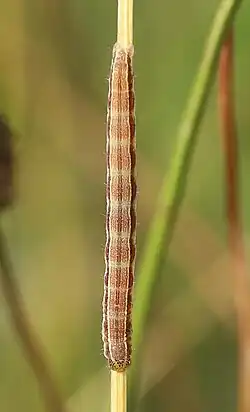 Erwachsene Raupen variieren farblich von graugrün über gelbgrau bis zu rötlich grau und zeigen mehrere gewellte, helle Längslinien. Rücken-, Nebenrücken- und Seitenlinien sind weißlich gefärbt. Sie haben außerdem eine feine, kurze, borstenartige Behaarung.