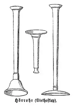 Im Jahr 1733 konnte der englische Pfarrer und Wissenschaftler Stephen Hales erstmals „blutig“, d. h. invasiv, den Blutdruck messen, indem er eine Kanüle in die Halsschlagader eines Pferdes einführte und mit einem Glaszylinder verband. Ab den 1840er Jahren konnte der Blutdruck mit dem von dem um 1850 die moderne Herz- und Kreislaufphysiologie begründenden Physiologen Ludwig entwickelten Kymographen aufgezeichnet werden. Das älteste herzwirksame Medikament ist Digitalis, dessen Nutzen für die Behandlung der durch das erkrankte Herz verursachten „Wassersucht“ 1785 William Withering beschrieb.[6] 1816 erfand der Franzose René Laënnec das Stethoskop, zunächst in Form recht einfacher hölzerner Zylinder, die eine Auskultation möglich machten. Die Auskultation des Herzens beschreibt er in seinem 1819 veröffentlichten Traité de l’auscultation médiate. Bereits Ende des 19. Jahrhunderts waren Stethoskope mit flexiblen Schläuchen für beide Ohren verbreitet. Bedeutsam für die Entwicklung der Kardiologie war zudem die von Leopold Auenbrugger (1761 dargestellt in Inventum novum) und Jean-Nicolas Corvisart eingeführte, von Josef von Škoda weiterentwickelte und 1839 in einer Abhandlung über Perkussion und Auskultation publizierte Diagnosetechnik der Perkussion.[7] Eine verlangsamend auf das Herz wirkende Vagusreizung wurde 1845 von Eduard Weber und Ernst Heinrich Weber (1795–1878) bekanntgegeben.[8] Ein frühes Gerät der indirekten „unblutigen“, d. h. nichtinvasiven Blutdruckmessung war z. B. der Sphygmograph des deutschen Physiologen Karl von Vierordt (1818–1884). Das erste Sphygmomanometer wurde vom österreichischen Pathologen Samuel Siegfried Karl Ritter von Basch (1837–1905) erfunden. 1896 beschrieb der italienische Arzt Scipione Riva-Rocci ein einfaches Gerät zur Blutdruckmessung mit einer Armmanschette, das von Harvey Williams Cushing verbessert wurde, und dessen Messmethode 1905 vom russischen Militärarzt Nikolai Sergejewitsch Korotkow abgewandelt wurde. Heutzutage wird nur noch selten nach der Methode von Riva-Rocci gemessen. Dann wird der so gemessene Blutdruck mit (RR) benannt. Fälschlicherweise wird der heutzutage nach Korotkow gemessene Blutdruck in der Praxis aber immer noch mit „RR“ bezeichnet.