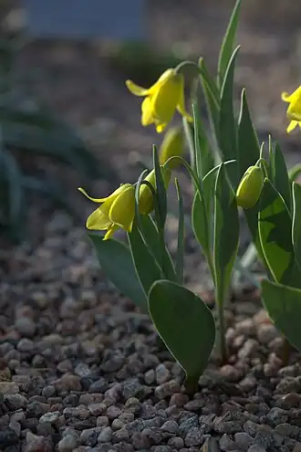 Die Blütezeit liegt im April, selten dauert sie bis Mai. Je Pflanzenexemplar sind ein bis Blüten vorhanden. Die zwittrige Blüte ist dreizählig. Die Blütenhüllblätter sind 13 bis 20 Millimeter lang. Die inneren Blütenhüllblätter sind 8 bis 9 Millimeter, die äußeren 4 bis 7 Millimeter breit.