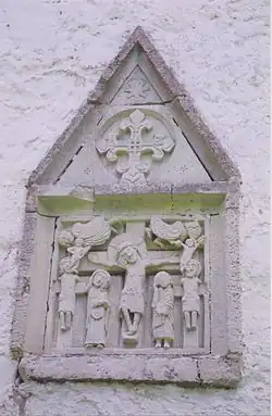 Die Wand der Vorhallen zeigt eine symmetrisch aufgebaute Kreuzigungsszene, wo die Seelen der beiden neben Jesus gekreuzigten Räuber vom Engel gerettet beziehungsweise vom Teufel geholt werden. Ihre Seelen sind als kleine Kinder dargestellt. Darunter betrauen Maria und Johannes den verstorbenen Jesus.
