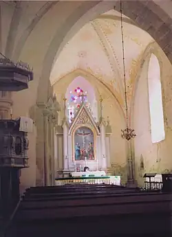 Der Taufstein stammt aus dem 14. Jahrhundert. Das Kruzifix aus Holz ist ein Werk des 15. Jahrhunderts. Die geschnitzte Kanzel im Stil der Renaissance wurde 1638 durch den vermutlich aus Schlesien stammenden Meister Balthasar Raschky geschaffen. An ihrer Seite befinden sich die Wappen der örtlichen Gutsherren.