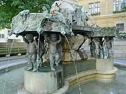 Aus gestalterischen Gründen wurde der Brunnen auf dem kleinen Vorplatz des Bezirksamtes etwas unter das Straßenniveau abgesenkt. Der Grund für die Absenkung liegt in den verschiedenen Maßstäben begründet, in denen die Putten und die Figurengruppen gefertigt wurden, weshalb der Brunnen zwei verschiedene Horizonte benötigt.