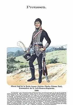 Während der vierten Koalition nahm er an der Schlacht bei Preußisch Eylau und dem Gefecht bei Braunsberg teil. Für seinen Einsatz vor Braunsberg erhielt er am 24. Februar 1807 den Orden Pour le Mérite.[2] La Roche-Aymon wurde am 5. Mai 1808 mit dem Orden des Heiligen Wladimir IV. Klasse ausgezeichnet und avancierte am 10. August selben Jahres zum Oberstleutnant sowie am 20. Dezember selben Jahres zum Kommandeur des 2. Leib-Husarenregiments. Er stieg am 3. November 1809 zum Oberst auf und wurde am 16. Februar 1810 Befehlshaber der westpreußischen leichten Brigade. Er hat am 5. April 1811 als Generalmajor mit einer jährlichen Pension von 600 Talern seinen Abschied aus preußischen Diensten erhalten. La Roche-Aymon wurde am 27. Juli 1811 mit dem Roten Adlerorden III. Klasse geehrt und erhielt gleichzeitig die Genehmigung die Generalsuniform oder die Uniform des 2. Leib-Husarenregiments zu tragen.