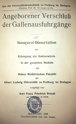 - ↑ Karl Brandt: Angeborener Verschluss der Gallenausfuhrgänge. Inaugural-Dissertation zur Erlangung der Doktorwürde in der gesamten Medizin der Hohen Medizinischen Fakultät der Albert Ludwig Universität zu Freiburg im Breisgau. Marburg 1929.