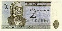 Karl Ernst von Baer ist auf der Vorderseite des estnischen Zwei-Kronen-Scheins abgebildet.