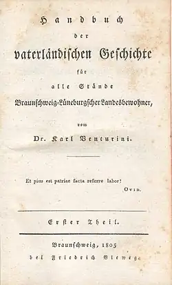 Mit seinem Handbuch der vaterländischen Geschichte für alle Stände Braunschweig-Lüneburgscher Landesbewohner beschritt Venturini vollkommen neue Wege bei der Beschreibung der Geschichte des Herzogtums Braunschweig. Im Geiste der Aufklärung unternahm er es als erster, eine wahrhafte „Volks- und Kulturgeschichte“ zu verfassen, da Landesgeschichte bisher ausschließlich als „Fürstengeschichte“ verstanden und wiedergegeben worden war. Dem „einfachen Volk“ kam dabei lediglich eine Statistenrolle zu; geschildert wurde ansonsten das Leben von Adel, Klerus und Städtern. Ursprünglich hatte Venturini vorgehabt sein Buch „Die Sassen und ihre Nachkommen in den Braunschweig-Lüneburgischen Landen“ zu betiteln, wählte schließlich jedoch den anderen. Das Handbuch gab den Forschungsstand seiner Zeit wieder und war in vieler Hinsicht wegweisend für die sich daran anschließende landesgeschichtliche Literatur.[3]