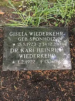 Karl Heinrich Wiederkehr wurde auf dem Friedhof Ohlsdorf beigesetzt. Die Grabstätte liegt im Planquadrat AA 43 südöstlich von Kapelle 9.