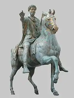 Aus der griechisch-römischen Bilderwelt stammt die Idee, das Pferd gleichsam als Podest zu verwenden, auf dem sich der Potentat über das gewöhnliche Volk erhebt. Das Reitmotiv ist zugleich eine Metapher für die Zähmung und Beherrschung der Natur und verweist auf die Fähigkeit des Reiters, die Bevölkerung zu führen und äußere Feinde zu bezwingen. Daher war das Reiterporträt in der Regel militärischen und politischen Führern vorbehalten.