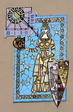 - 1964 Stadtwappen Coswiger Jungfrau mit Sonnenuhr; Keramikwandbild