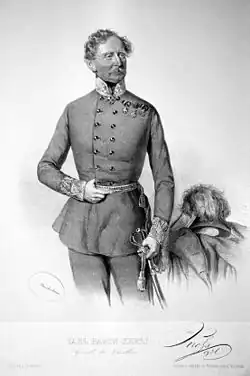 Bald darauf wurde ihm die Geheimratswürde und am 10. Januar 1851 der Charakter eines Generals der Kavallerie verliehen.[7] Der Freiherr wurde im Laufe seiner Karriere auch zum kaiserlichen Wirklichen Kämmerer und Oberst-Inhaber des Ulanen-Regiments Kaiser Alexander von Russland Nr. 11 ernannt, war unter anderem Träger des Großkreuzes des kaiserlich königlichen Ordens vom Weißen Adler, des russisch-kaiserlichen St. Annen-Ordens zweiter Klasse und des Ritterkreuzes des königlich französischen Militär-St.-Ludwig-Ordens.[6][9] Zu seiner Beerdigung rückten vier Bataillone Infanterie, zwei Divisionen Kavallerie und zwei Batterien aus. Die Einsegnung des Leichnams erfolgte nach evangelischem Ritus. Das Militär nahm die Aufstellung am Graben und am Josephsplatz und feuerte die Geschütz- und Musketensalven am Glacis ab.[10]