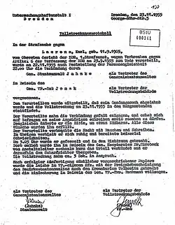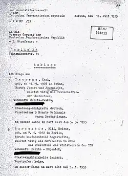 - ↑ BStU, MfS, ZA, AU 406/55, Bl. 92: Eröffnungsbeschluß „Termin zur Hauptverhandlung ist auf den 23. September 1955, vorm. 9.oo Uhr anberaumt worden. Bl. [für Berlin], d. 16.9.1955“.