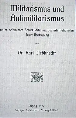 Für die Jugendarbeit der SPD veröffentlichte er 1907 die Schrift Militarismus und Antimilitarismus,[11] für die er noch im selben Jahr wegen Hochverrat verurteilt wurde. In dieser Schrift führte er aus, der äußere Militarismus brauche gegenüber dem äußeren Feind chauvinistische Verbohrtheit und der innere Militarismus benötige gegen den inneren Feind Unverständnis bzw. Hass gegenüber jeder fortschrittlichen Bewegung. Der Militarismus brauche außerdem den Stumpfsinn der Menschen, damit er die Masse wie eine Herde Vieh treiben könne. Die antimilitaristische Agitation müsse über die Gefahren des Militarismus aufklären, jedoch müsse sie dies im Rahmen der Gesetze tun. Letzteren Hinweis nahm ihm später das Reichsgericht im Hochverratsprozess nicht ab. Den Geist des Militarismus charakterisierte Liebknecht in dieser Schrift mit einem Hinweis auf eine Bemerkung des damaligen preußischen Kriegsministers General Karl von Einem, wonach diesem ein königstreuer und schlecht schießender Soldat lieber sei als ein treffsicherer Soldat, dessen politische Gesinnung fraglich bzw. bedenklich sei. Am 17. April 1907 beantragte von Einem bei der Reichsanwaltschaft, wegen der Schrift Militarismus und Antimilitarismus gegen Liebknecht ein Strafverfahren einzuleiten.